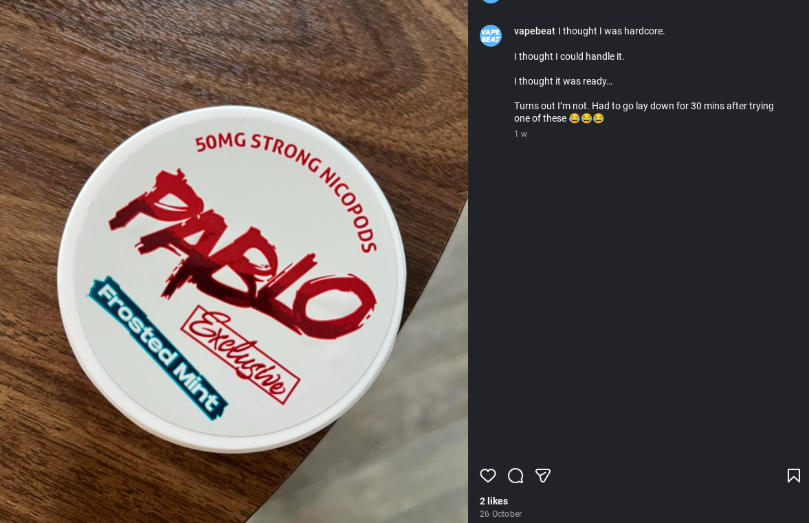 I bought a pack of Pablo nicotine pouches, thinking I could handle it. I could not. Within moments of popping it in my mouth, I had to take it out and go and lay down for 20 minutes.