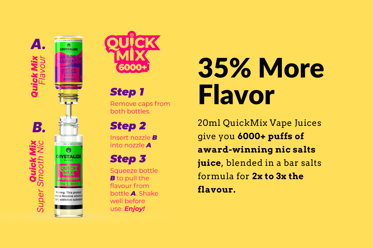 The QuickMix format is one of our most popular. It costs £5.95 for 20ml and there’s over 20 award-winning flavours to choose from. If you like value for money, high-quality UK-made vape juice, you’ll love Crystalize QuickMix e-liquid.